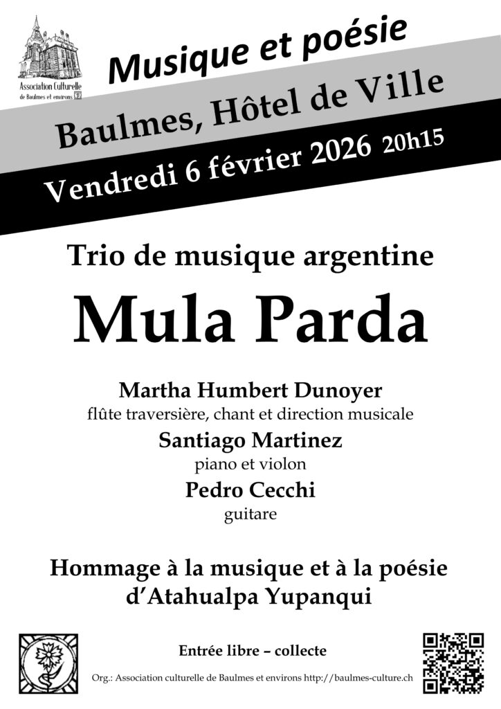Pour le concert à Baulmes le vendredi 6 février, Mula Parda présentera un programme inspiré par cet album et proposera également la lecture de textes et poèmes d’Atahualpa Yupanqui, dans un dialogue entre musique et poésie. Le concert a lieu à la salle de concert de l’Hôtel de ville de Baulmes, dont l’acoustique offrira un écrin magnifique pour le trio Mura Parda. Concert à 20h15, entrée libre, collecte à la sortie.