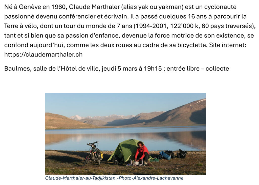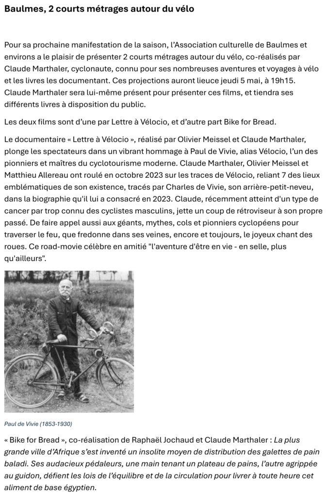 Lettre à velocio : https://claudemarthaler.ch/lettre-a-velocio/